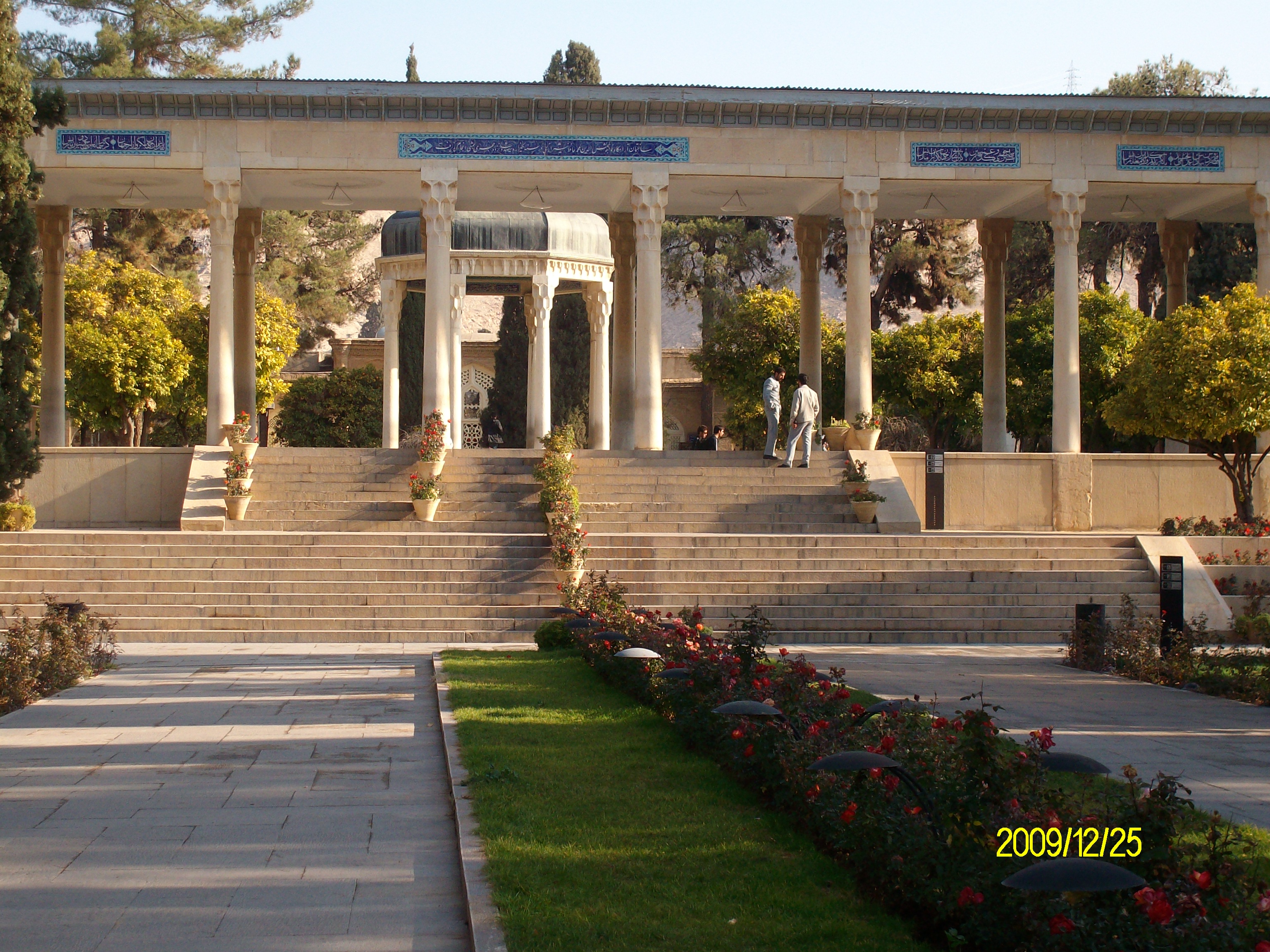 이란의 중남부 도시 쉬라즈에 있는 시인 사디의 묘지기념관 입구 계단 -묘각지붕은 청동으로 되어있다.
