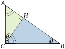 B C A B = B H B C and A C A B = A H A C . {\displaystyle {\frac {BC}{AB}}={\frac {BH}{BC}}{\text{ and }}{\frac {AC}{AB}}={\frac {AH}{AC}}.}
