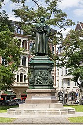 Luther Monument in Worms.웜스의 루터 기념비 His statue is surrounded by the figures of his lay protectors and earlier Church reformers including John Wycliffe, Jan Hus and Girolamo Savonarola. 그의 동상은 존 와이클리프, 얀 후스, 지롤라모 사보나롤라 등 그의 평신도들과 초기 교회 개혁가들의 모습으로 둘러싸여 있다.