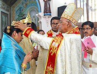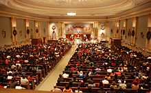 Nearly all forms of worship incorporate the Eucharist, which consists of a meal. It is reenacted in accordance with Jesus' instruction at the Last Supper that his followers do in remembrance of him as when he gave his disciples bread, saying, "This is my body", and gave them wine saying, "This is my blood".[99] In the early church, Christians and those yet to complete initiation would separate for the Eucharistic part of the service.[100] Some denominations such as Confessional Lutheran churches continue to practice 'closed communion'.[101] They offer communion to those who are already united in that denomination or sometimes individual church. Catholics further restrict participation to their members who are not in a state of mortal sin.[102] Many other churches, such as Anglican Communion and United Church of Canada, practice 'open communion' since they view communion as a means to unity, rather than an end, and invite all believing Christians to participate.[103][104]