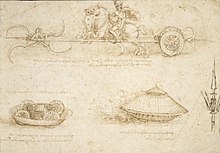 Leonardo's drawings of a scythed chariot and a fighting vehicle.레오나르도의 치트 전차와 전투 차량에 대한 그림.