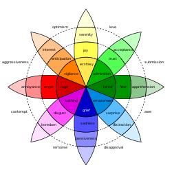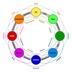 1980년 Robert Plutchik 은 자신의 10가지 공리 에서 영감을 받아 기쁨, 신뢰, 두려움, 놀람, 슬픔, 혐오, 분노, 기대 등 8가지 감정의 바퀴를 도표화했습니다 . [45] [46] Plutchik은 또한 24개의 "일차", "이차" 및 "제3차" 이중(두 가지 감정으로 구성된 감정)을 이론화했습니다. [47] [48] [49] [50] [51] [52] [53] 휠 감정은 네 그룹으로 짝을 이룰 수 있습니다.
