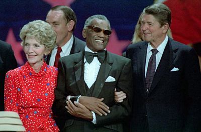 레이건 대통령과 영부인 낸시의 부축을 받고 있는 가수 레이 챨스. 레이 챨스는 이날 레이건 대통령 부부가 어떻게 생겼는지 볼수는 없지만 만난 것만으로도 생애 최고의 기쁨이라고 말하며 눈물을 흘렸다.