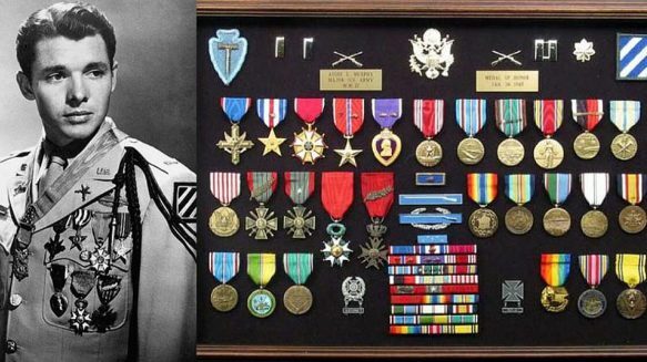 2차대전의 영웅 오디 머피와 그가 받은 무공훈장들. 그는 나중에 할리우드 배우로도 활동했다.