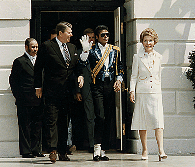 백악관을 방문한 마이클 잭슨이 레이건 대통령 및 영부인 낸시와 함께 걸어나오고 있다. 1984년.