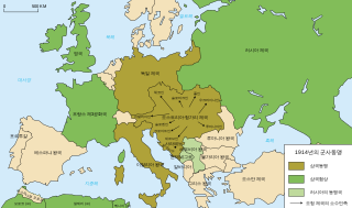 7월 28일, 오스트리아-헝가리 제국이 세르비아를 침공하면서 제1차 세계 대전이 시작되었다.[16][17] 러시아가 총동원령을 내리면서 독일군은 중립국인 룩셈부르크와 벨기에를 침공하면서 프랑스로 진격했고, 이로 인해 영국이 독일에게 선전포고했다. 파리 앞에서 독일군이 진격을 멈춘 이후, 서부 전선은 1917년까지 참호전과 같은 소모전 양상으로 굳어지게 된다. 한편, 동부 전선에서는 러시아군이 오스트리아-헝가리 제국 내로 진격하는데는 성공했지만 동프로이센 침공은 독일군의 반격으로 실패하게 된다. 1914년 11월에는 오스만 제국이 참전하면서 전역이 코카서스, 메소포타미아, 시나이반도 등으로 확대되게 된다. 이탈리아와 불가리아는 1915년 참전했고, 루마니아 왕국은 1916년 참전했으며, 미국은 1917년 참전했다.