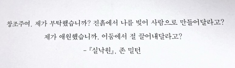 내가 저지른 끔찍한 짓을 하나씩 돌이켜 보면, 한때 숭고하고 초월적인 미와 장대한 선의 비전으로 생각이 꽉 차 있던 존재였다는게 도저히 믿기지 않습니다. 하지만 내 말은 사실입니다. 타락한 천사가 사악한 악마가 되는 법이지요. 하지만 신과 인간의 원수조차 외로움을 나눌 벗과 동료가 있소. 그러나 나는 철저히 혼자요!