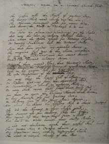 The first version of the elegy is among the few early poems composed by Gray in English, including "Sonnet on the Death of Richard West", his "Eton Ode", and his "Ode to Adversity". All four contain Gray's meditations on mortality that were inspired by West's death.[48] The later version of the poem keeps the stoic resignation regarding death, for the narrator still accepts death. The poem concludes with an epitaph, which reinforces Gray's indirect and reticent manner of writing.[28] Although the ending reveals the narrator's repression of feelings surrounding his inevitable fate, it is optimistic. The epitaph describes faith in a "trembling hope" that he cannot know while alive.[49]