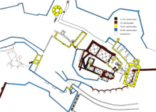두 번째 건설 단계에서 직사각형 건물의 북쪽 부분은 측면 길이가 9.50m인 정사각형 타워 로 변환되었습니다 . 세심한 모서리 애싱이 있는 남서쪽 모서리와 타워의 서쪽 벽은 서쪽 날개 내부에서 최대 8미터 높이까지 보존됩니다. 탑의 서쪽, 남쪽, 북쪽 에는 같은 높이의 여러 곳에서 원형 벽 이 발견되었으며 , 그 벽돌은 탑의 높이에 해당합니다. 링 벽과 타워 사이의 영역은 두꺼운 붉은 모래 층으로 채워졌습니다. 이것은 서쪽의 주요 공격 측을 강화했고 타워는 부분적으로 " 나방 형", 말하자면 공성 장비 에 의해 파괴되기 전에 뒤쪽으로 채워진 링 벽 주위에 있었을 것입니다.보호하기 위해. 이 고리 벽의 더 많은 유적이 남쪽 별관에 보존되어 있거나 관련된 가로 벽과 함께 사람들의 집 안팎에서 발굴될 수 있었습니다. 따라서 그것은 링 벽 위나 위에 집 가장자리에 타워와 개별 건물이있는 일종의 성입니다.