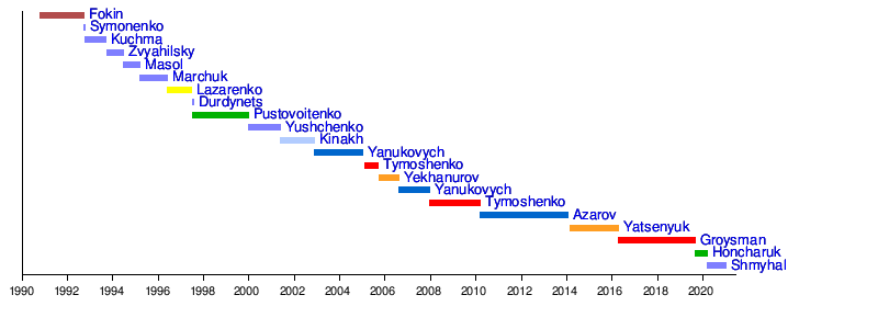 1991년 소련으로부터 우크라이나가 독립한 이래로, 15명의 총리[3](연기 PM를 포함하여 19명)가 있었다. 율리아 티모셴코는 우크라이나의 첫 번째 (그리고 유일한) 여성 총리였다. 미콜라 아자로프 총리로 재임명되기 전, 티모셴코는 두 번의 임기와 총 1,029일 동안 복무하는 가장 긴 총리였다(대리 총리로 봉사하는 날은 이 숫자에 포함되지 않음). [15] 아자로프가 2012년 12월 13일에 총리로 재임명된 이후로, 그는 이후 티모셴코의 기록을 깨뜨렸다. [16][17] 아자로프는 유로마이단 이후 대중의 항의와 항의로 인해 2014년 1월 28일 사임했다. [18] 그는 2014년 2월 27일에 Arseniy Yatsenyuk에 의해 계승되었다. [19] Yatsenyuk는 2014년 7월 24일에 총리직을 사임하겠다고 발표했다. [19] 그러나 그의 사임은 2014년 7월 31일 의회에 의해 거부되었고, 16명의 하원의원들(450명 중)만이 그의 사임에 찬성표를 던졌다. [20][21]