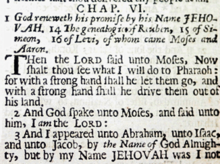 - ↑ According to the preface, this was because the translators felt that the "Jewish superstition, which regarded the Divine Name as too sacred to be uttered, ought no longer to dominate in the English or any other version of the Old Testament".