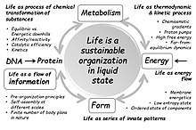삶의 정의는 오랫동안 과학자와 철학자들에게 도전이었습니다. [9][10][11] 이것은 부분적으로 생명이 물질이 아니라 과정이기 때문이다. [12][13][14] 이것은 지구 밖에서 발전했을 수도 있는 생명체의 특성에 대한 지식이 부족하여 복잡하다. [15][16] 생명에 대한 철학적 정의도 제시되었으며, 생물과 비생물을 구별하는 방법에 대해서도 비슷한 어려움이 있다. [17] 삶에 대한 법적 정의도 설명되고 논의되었지만, 이들은 일반적으로 인간 사망자를 선언하는 결정과이 결정의 법적 파급 효과에 초점을 맞추고 있습니다. [18] 생명에 대한 123개의 정의가 작성되었다. [19] NASA가 선호하는 한 가지 정의는 "다윈의 진화가 가능한 자립적 인 화학 시스템". [20][21][22][23] 더 간단히 말해서, 생명은 "생존이 지시하는 대로 스스로 번식하고 진화할 수 있는 물질"이다. [24][25][26]