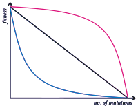 사실, 피트니스 풍경에 대한 유전자형은 더 복잡합니다. 집단 유전학은 이러한 복잡성을 자세히 모델링하거나 더 간단한 평균 규칙으로 포착해야합니다. 경험적으로, 유익한 돌연변이는 이미 높은 체력을 가진 유전 적 배경에 추가 될 때 더 작은 체력 이점을 갖는 경향이 있습니다 : 이것은 수익률 epistasis를 감소시키는 것으로 알려져 있습니다. [21] 해로운 돌연변이가 높은 피트니스 배경에 더 작은 체력 효과를 가질 때, 이것은 "상승 작용 epistasis"로 알려져 있습니다. 그러나, 해로운 돌연변이의 효과는 평균적으로 증식에 매우 근접한 경향이 있거나, 심지어 "길항성 epistasis"로 알려진 반대 패턴을 보일 수도 있다. [22]