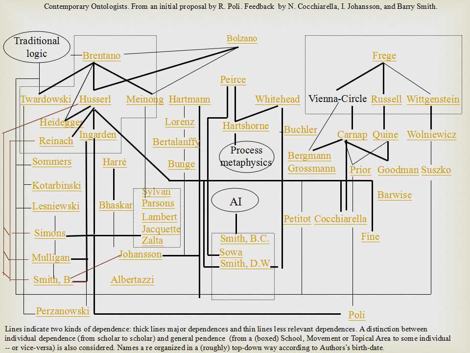 열아홉 세기의 주요 존재론자인 버나드 볼차노(Bernard Bolzano, 1781-1848), 프란츠 브렌타노(Franz Brentano, 1838-1917), 고틀롭 프레지(Gottlob Frege, 1848-9125)와 현대 사상가들의 주요 지적 연결고리는 "온톨로지스트의 표"에서 찾을 수 있다.