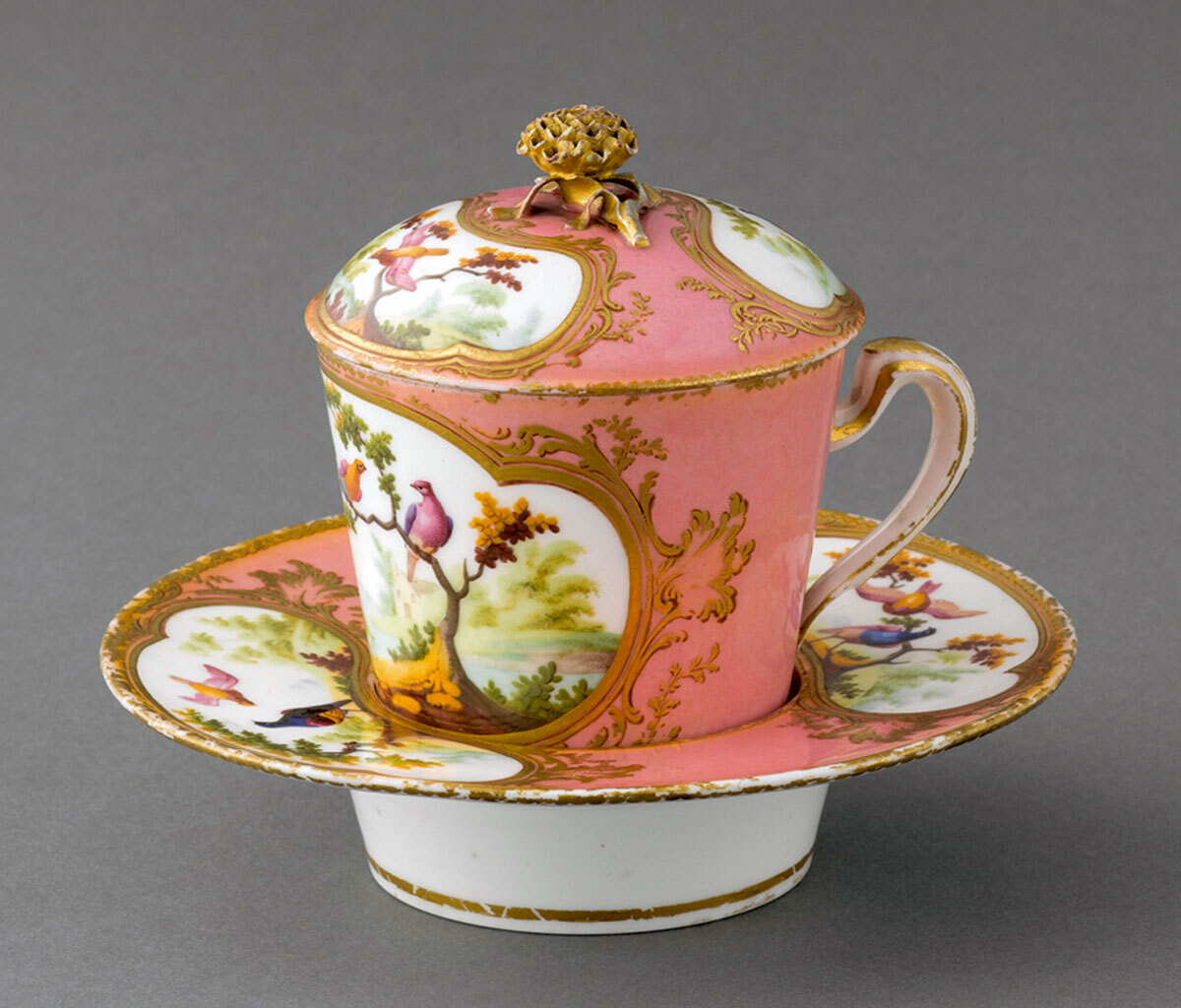 Böttger는 유럽 최초의 하드 페이스트 도자기 생산자 인 Meissen에있는 Augustus the Strong의 새로운 공장을 담당했습니다. Meissen의 성공은 다른 유럽 통치자들이 자신의 공장을 설립하고 공식을 신성화하거나 훔치려고 시도하도록 자극했습니다. Louis XV의 제조소는 1740 년 파리 근처의 Vincennes에 설립되었으며 1756 년에는 도시 반대편에있는 Sèvres로 옮겨졌습니다. Sèvres 공장은 프랑스 제조업체가 리모주 근처에서 대량의 카올린 매장지를 우연히 발견한 직후인 1760년대 후반까지 진정한 도자기 생산을 시작하지 않았지만 초기에는 점토와 분말 유리로 만든 인공 소프트 페이스트 버전을 개발하여 유럽 전역의 부유한 수집가들이 존경했습니다. 위에 표시된 우유 잔은이 부드러운 페이스트 기술을 사용하여 만들어져 욕망과 명성의 대상으로서의 지위를 더합니다.