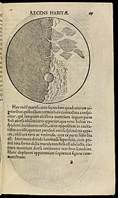 1609년 11월 30일, 갈릴레오는 망원경으로달을 겨냥했습니다. [47] 망원경으로 달을 관찰한 최초의 사람은 아니지만(영국 수학자토마스 해리엇은 4개월 전에 달을 관찰했지만 "이상한 점박이"만 보았습니다),[48]갈릴레오는 달의 산과분화구에서 빛이 가려진 고르지 않은 쇠퇴의 원인을 처음으로 추론했습니다. 그의 연구에서 그는 또한 산의 높이를 추정하는 지형도를 만들었습니다. 달은 아리스토텔레스가 주장한 것처럼 반투명하고 완벽한 구체로 오랫동안 생각되었던 것이 아니었고,단테가 제시한 것처럼 "천상의 엠피리안으로 웅장하게 올라갈 영원한 진주"인 최초의 "행성"이 아니었습니다. 갈릴레오는 때때로 1632년위도에서 달의 해방을 발견한 것으로 알려져 있지만,[49]토마스 해리엇이나윌리엄 길버트가 이전에 그것을 했을 수도 있습니다. [50]