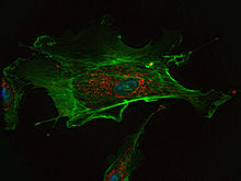 내피 세포의 형광 이미지. 핵은 파란색으로 염색되고미토콘드리아는빨간색으로 염색되며 마이크로 필라멘트는 녹색으로 염색됩니다.