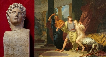 [향연]에서 등장하는 최고의 ‘꽃미남’ 알키비아데스는 소크라데스의 제자로도 유명하다. 그는 소크라테스를 끊임없이 (육체적으로) 유혹하지만, 소크라테스는 그 유혹을 뿌리친다. 알키비아데스의 그리스 조각을 모사한 로마 시대 조각(왼쪽)과 육체를 탐닉하는 알키비아데스를 끌고 나오려는 소크라테스(오른쪽, 장 밥티스트 레뇨, 1791)