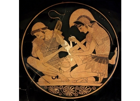 활에 맞아 다친 파트로클로스(Patroclus)의 팔을 치료하는 아킬레우스(Achilles). 기원전 500년. 호메로스는 이 둘의 동성애를 가장 순수하고 고상한 사랑이라고 찬양했다.