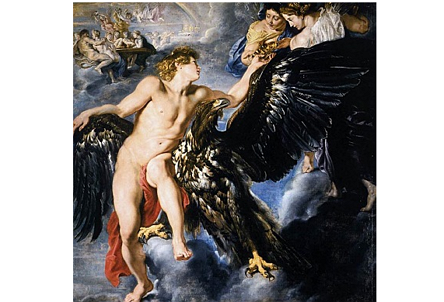 독수리로 변해 트로이의 미소년 가니메데스를 납치하는 제우스(루벤스, 1611-12). 가니메데스를 라틴어로 표기하면 카타미투스(Catamitus)인데, 동성애 상대 소년을 의미하는 캐터마이트(Catamite)가 여기에서 유래했고, 17~18세기 프랑스와 영국에서는 가니메데스가 동성애에서 여성 역할을 하는 이들을 가리키는 말로 사용되었다고 한다. (내용 참고 및 출처: 줄리아의 친절한 미술관, ‘가니메데스-동성애의 시작’ 중에서) .