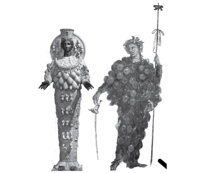 젖가슴이 풍성한 여신 아르테미스와 포도알을 주렁주렁 단 디오니소스. 디오니소스를 통해 여신의 이미지를 가져오려는 의도를 엿볼 수 있다.
