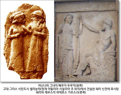 농경이 도래한 뒤 5,000년 동안 우리 인류는 봄마다 대지에 새로운 생명이 솟아나는 것을 위대한 어머니 여신이 사랑하는 아들·연인·남매를 부활시키는 것에 비유해 왔다. 이난나와 두무지, 이시스와 오시리스, 이슈타르와 탐무즈, 아프로디테와 아도니스 이야기가 모두 이와 연관된 신화들이다. 히에로스 가모스(ἱερὸς γάμος; 신성결혼)라는 고대의 가장 성스러운 의식에서도 남자는 인간인 반면, 여자는 여신이었다.
