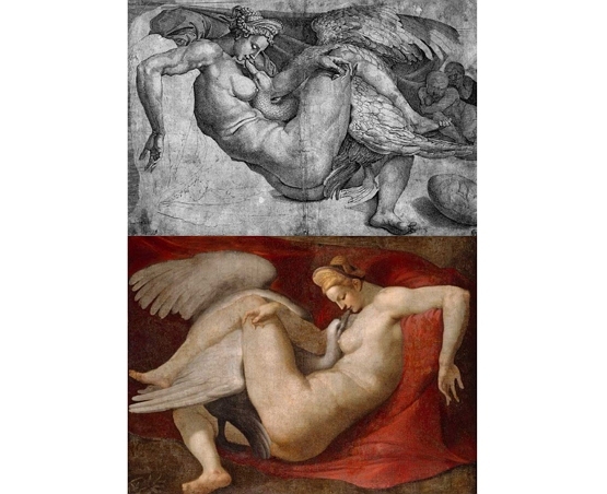 백조로 변신해 스파르타의 왕비 레다를 겁탈하는 제우스. 미켈란젤로는 1529년 알폰소 데스테로부터 주문 받고 그린 ‘레다와 백조’를 그렸지만, 우여곡절 끝에 자신이 소장하게 되자 제자이자 조수인 안토니아 미니(Antonia Mini)에게 작품을 줬고, 미니는 1532년 작품을 프랑스 왕궁에 팔았다. 하지만 이후로 작품은 사라졌다. 하지만 미니는 작품을 프랑스 왕궁에 팔기 전에 모작을 그려놨고, 그 모작을 코르넬리스 보스(Cornelis Bos)가 판화로 그렸다(위쪽 그림). 그리고 후에 그 판화를 보고 페테르 파울 루벤스가 유화(1560)로 그렸다(아래쪽 그림).