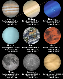 선택한 태양계 본체의 축 및 회전몸NASA , J2000.0 [38] 신기원IAU , 0h 0 1월 2010 TT [39] 에포크축 기울기(도)북극회전기간(시간)축 기울기(도)북극회전(도/일)RA (도)12월 (도)RA (도)12월 (도)| 해 | 7.25 | 286.13 | 63.87 | 609.12 [아] | 7.25 [비] | 286.15 | 63.89 | 14.18 |