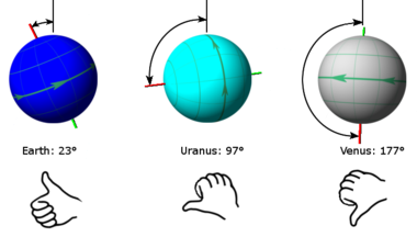 - IAU는 또한 오른손 법칙을 사용하여 방향을 결정하기 위해 양극 [6] 을 정의합니다. 이 규칙을 사용하여 금성은 177°("거꾸로") 기울어지고 순방향 회전합니다.