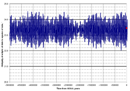 수치적 방법 을 사용 하여 태양계 동작 을 시뮬레이션 하여 지구 궤도 의 장기적인 변화 와 그에 따른 기울기가 수백만 년에 걸쳐 조사되었습니다. 지난 500만년 동안 지구의 기울기는 평균 41,040년 동안 22°2′33″ 에서 24°30′16 ″ 사이에서 변화했습니다. 이 주기는 세차 운동과 황도 운동의 가장 큰 항의 조합입니다 . 다음 100만 년 동안 주기는 22°13′44″ 와 24°20′50 ″ 사이의 경사를 유지 합니다. [27]
