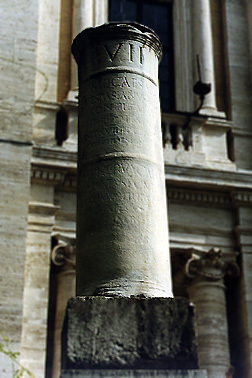이 시스템은 아우구스투스에 의해 완성되었는데, 아마도 율리우스 카이사르가 도보로 설정한 제국의 도로 측정과 관련하여 그 결과가 소위 안토닌 여정에 기록되었을 것입니다. 아우구스투스는 큰 도로가 로마의 여러 문으로 갈라지는 중앙 지점을 표시하기 위해 로마의 포럼에 금박 대리석 기둥을 세웠습니다( Dion Cass. LIV .8 ; Plut. Galb. 24 ). 그것은 Milliarium Aureum 이라고 불렀습니다 . 그 위치는 capite Romani Fori (Plin. H. N. III . 5, s9) , sub aedem Saturni (Tac. 역사. 나 .27) . 그것의 일부는 셉티미우스 세베루스의 아치 근처에 여전히 존재하며, 둥근 바닥과 미세한 대리석 조각으로 구성되어 있습니다. • 직경 4½피트, 전체 높이 • 약 10피트(Platner u. Bunsen, Beschreib. d. Stadt Rom. vol. III , pt. 1, p73; pt. 2, p102; Platner u. Urlichs, Beschreib. Roms, p20). 대리석 기둥의 각 면은 금동판으로 덮여 있었던 것 같다. 그러나 그것들에 새겨진 정보가 단순히 거리와 함께 각 도로의 주요 장소 목록으로 구성되었는지 또는 거리가 표시된 각 도로 세트에 대한 일종의 지도가 있었는지 여부는 현재 알려지지 않았습니다. 또한 마일이 기둥 자체에서 계산되기 시작했는지 또는 성문에서 계산되기 시작했는지도 불확실합니다(Mém. de l'Acad. des Inscr. vol. XXVIII p388, &c.; Ideler, in the Mém. de l'Acad. des Inscr. Abhandl.d . Berl. Acad. 1812, pp134, 164).