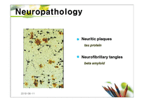 의부증으로 병원에 입원하여 빠른 속도로 치매증세를 보였던 56세 여자 환자의 임상적 특징과 병리 조직 소견을 발표함으로써 후에 알쯔하이머병으로 알려지게 되었습니다. 알쯔하이머가 발견한 뇌 조직의 이상인 노인반과 신경섬유다발은 오늘날에도 알쯔하이머병을 진단하는 기준으로 사용되고 있습니다