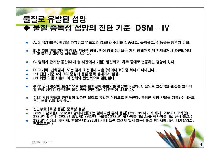 ◆ 물질 금단성 섬망의 기준 DSM - IV