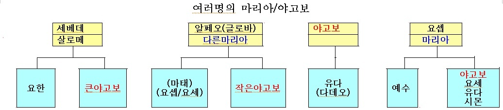 •도표엔 없으나 ③요한 마가의어머니, ④로마의 마리아, ⑤막달라마리아, ⑥베다니 마리아가 있습니다 (3명의 마리아)