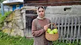 여자는 산에서 혼자 산다. 치즈로 사과 잼과 팬케이크 요리하기