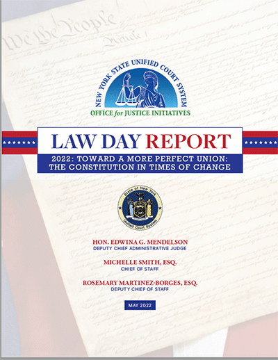 매년 5월 1일에 기념하는 법의 날은 우리 사회에서 우리의 자유를 보호하고 정의를 추구하는 법의 역할을 기념할 기회를 제공합니다. 법의 날을 기념하여 정의 이니셔티브 Hon. Edwina G. Richardson-Mendelson과 OJI(Office for Justice Initiatives)는 첨부된 창립 법률의 날 보고서를 발행합니다.. 일련의 연간 계획 문제 중 첫 번째인 이 보고서는 올해 법의 날 주제인 "지금 법치주의 발전"과 법무부 이니셔티브 사무국(Office for Justice Initiatives)의 사명을 반영하여 문을 통과하는 모든 사람이 정의에 의미 있게 접근할 수 있도록 보장합니다. 모든 뉴욕주 법원의 이 보고서는 주로 지난 몇 년 동안 운영된 OJI의 기존 프로그램과 프로젝트를 자세히 설명하는 "사법 사무소 이니셔티브 프로그램의 풍경"과 이러한 프로그램과 이니셔티브를 설명하는 "정의 재구상"의 두 섹션으로 구성됩니다. 작년의 전례 없는 사건을 통해 개발되었거나 가까운 시일 내에 출시될 예정입니다.