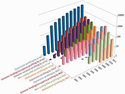 작성 당시 GEO 데이터베이스는 >32 개의 유기체에서 파생 된 000,13 개의 샘플로 구성된 000,800 개의 실험실에서 직접 제출 한 >000,1600 개의 공개 시리즈 (연구 기록)를 호스팅합니다. 그림 1에서 볼 수 있듯이 전체 제출률은 계속 증가하고 있습니다. 2011년에만 >6800개의 새로운 시리즈가 처리되어 전년 대비 22% 증가했습니다. GEO에 보관된 데이터 유형은 기능 유전체학 커뮤니티에서 사용하는 기술 및 방법론의 진화하는 추세를 반영합니다. '배열에 의한 표현식 프로파일 링'은 성장 속도가 느려지고 있지만 GEO에 제출 된 가장 일반적인 연구 유형입니다. 차세대 서열 제출률은 2008년 이후 빠르게 증가하고 있습니다. 흥미롭게도 시퀀싱에 의한 염색질 면역침전법(ChIP-seq, 그림 1의 'NGS에 의한 게놈 결합/점유 프로파일링'에 포함됨)과 같은 방법은 현재 어레이 기반 대응물인 ChIP-chip보다 더 높은 빈도로 제출되는 속도로 증가하고 있습니다. 한편, 전통적인 SAGE (유전자 발현의 연속 분석) 제출은 이제 드물다.