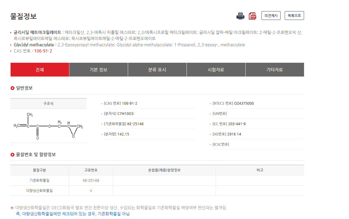 CAS No. 106-91-2 의 GMA (Glycidyl methacrylate) 를 '화학물질 통합 검색' 을 이용하여 검색했습니다.