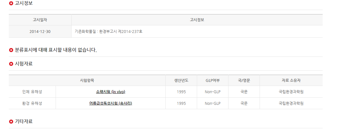 관련 법규에 대한 고시일에 대한 확인과 분류표시 등과 시험자료 등에 대해 확인 할수 있습니다.