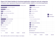 WIPO는 2019년 특허 출원 건수와 특허 출원 건수에서 AI가 가장 많은 신흥 기술이라고 발표했으며, 시장 규모에서는 사물인터넷이 가장 큰 것으로 추정했다.그 뒤를 이어 빅데이터 기술, 로봇 공학, AI, 3D 프린팅, 5세대 모바일 서비스(5G)[159]가 뒤를 이었다.1950년대 AI가 등장한 이후 혁신가에 의해 3400만건의 AI 관련 특허출원이 이뤄졌고 연구진에 의해 160만건의 과학논문이 발표됐으며 2013년 이후 AI 관련 특허출원의 대다수가 발표됐다.AI 특허출원 상위 30개 중 26개 기업이 대표하고 나머지 [160]4개 기업이 대학이나 공공연구기관이다.발명품 대비 과학논문 비율이 2010년 8대 1에서 2016년 3대 1로 크게 감소해 이론연구에서 상업용 제품 및 서비스 분야 AI 기술 활용으로 전환했음을 시사하는 것으로 풀이된다.머신러닝은 특허에 공개된 지배적인 AI 기술로, 식별된 발명품 중 3분의 1 이상(2016년 출원된 총 167038건의 AI 특허에 대해 출원된 134777건의 머신러닝 특허)에 포함되어 있으며, 컴퓨터 비전이 가장 인기 있는 기능 애플리케이션이다.AI 관련 특허는 AI 기술과 응용 분야를 공개하는 것은 물론, 응용 분야나 산업을 지칭하는 경우도 많다.2016년에는 통신(15%), 교통(15%), 생명 및 의학(12%), 개인용 기기, 컴퓨팅 및 인간-컴퓨터 상호작용(11%) 순으로 20개의 응용 분야가 확인되었습니다.기타 부문에는 은행, 엔터테인먼트, 보안, 산업 및 제조업, 농업, 네트워크(소셜 네트워크, 스마트 시티 및 사물 인터넷 포함)가 포함되었습니다.IBM이 8,290개의 특허를 출원해 가장 많은 AI 특허 포트폴리오를 보유하고 있으며, 마이크로소프트가 5,930개의 특허를 [160]출원해 그 뒤를 잇고 있다.