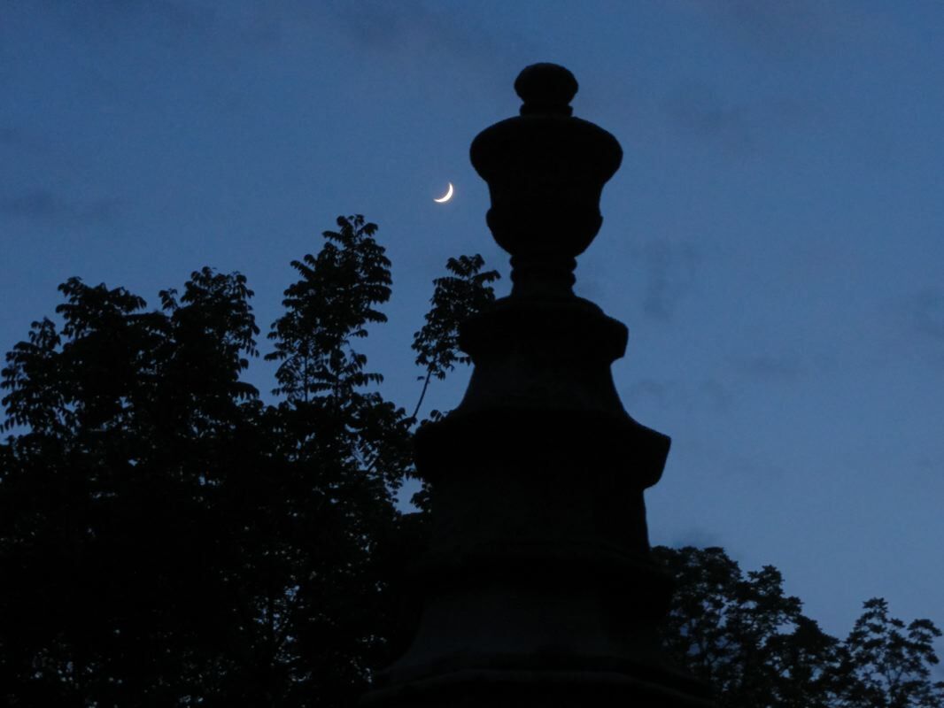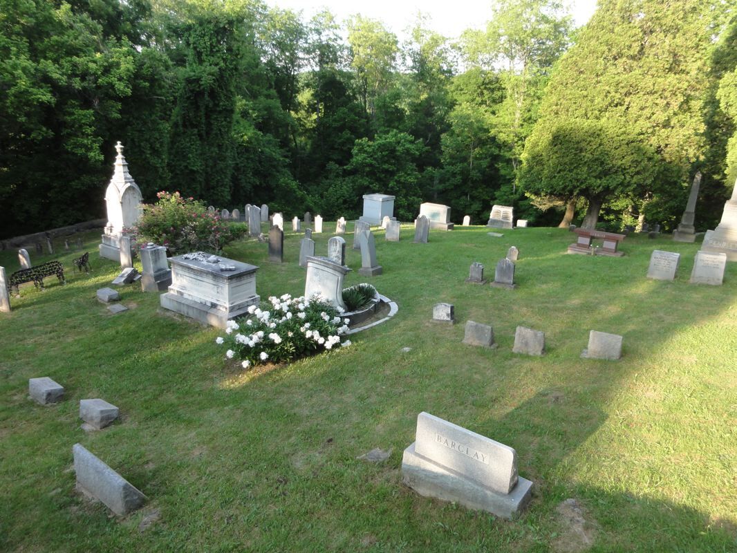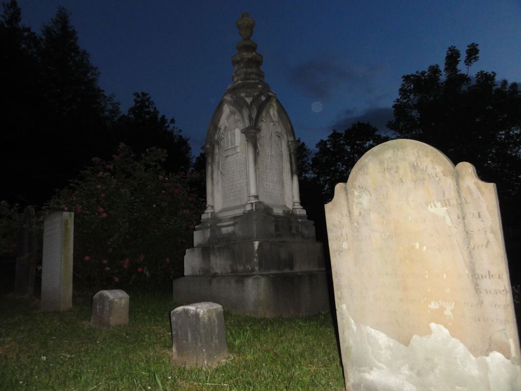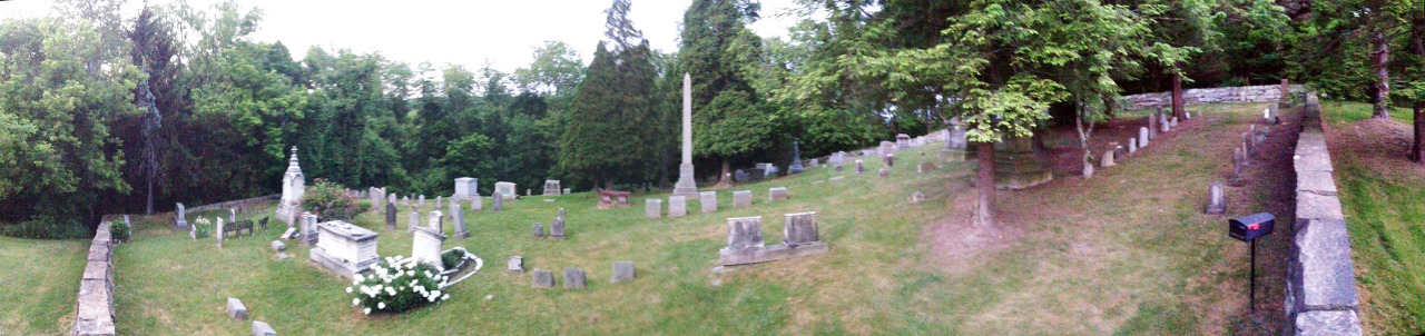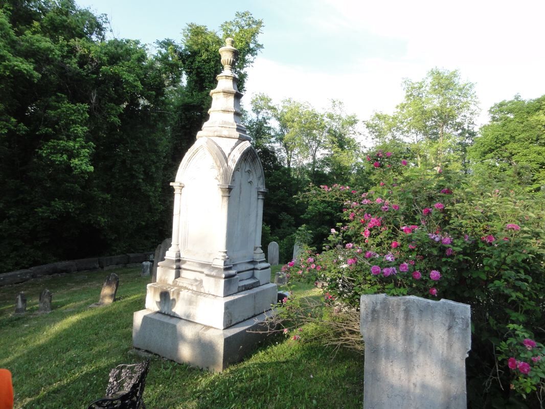 전경에서 갈색을 띤 돌은 알렉산더의 첫 부인인 마가렛 브라운 캠벨 의 돌입니다 . 뒤에 있는 큰 비석은 알렉산더와 그의 두 번째 부인 셀리나의 것입니다. Campbells와 기타 복원 운동의 고위 인사들은 옛 저택 건너편 언덕에 있는 묘지인 God's Acre에 묻혔습니다.
