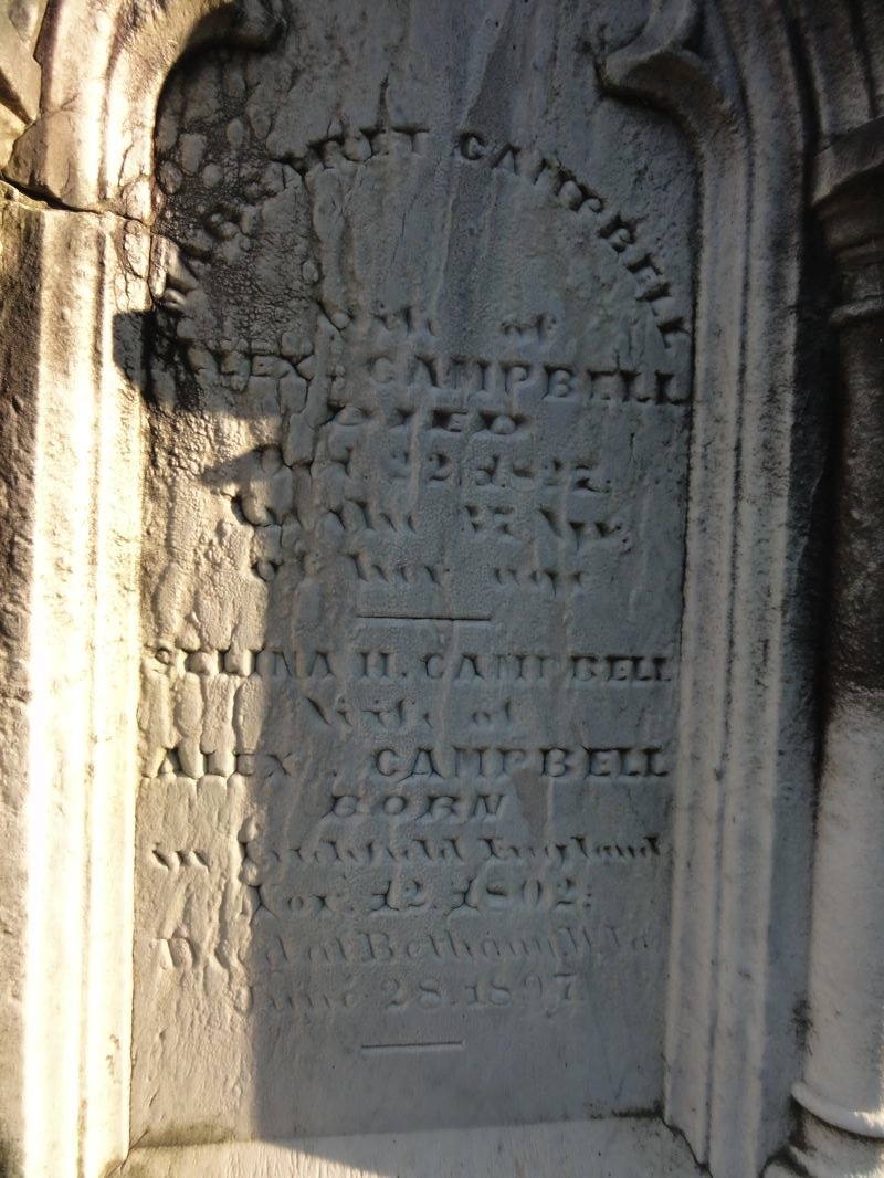 의 아내 1827년 10월 22일 37세 의 나이 로 사망 _____________ 셀리나 H. 캠벨 알렉스 캠벨 의 아내 영국 리치필드에서 출생 1802년 11월 12일 더블류 버지니아 베다니에서 사망 1897년 6월 28일