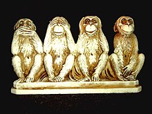 See also: evil, hear, no, see, speak세 원숭이(일본어: 三猿)는 일본의 격률로, "악을 보지 말고, 악을 듣지 말고, 악을 말하지 말라"라는 속담을 나타내고 있다.[1] 각각의 세 원숭이의 이름과 뜻은 다음과 같다.