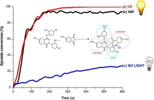 시스템의 광중합 성능은 그림 1A에 나와 있습니다. 서로 다른 조사 조건에 대해 두 가지 광화학 시스템을 비교합니다. UV/visible에서 2-ITX/Iod 시스템은 근적외선에서 IR813/Iod 시스템보다 더 나은 응답성을 나타냅니다. 2-ITX/Iod 시스템(그림 1a)에 대한 조사 300초에서 100%의 최대 에폭시 기능 변환에 도달합니다. 같은