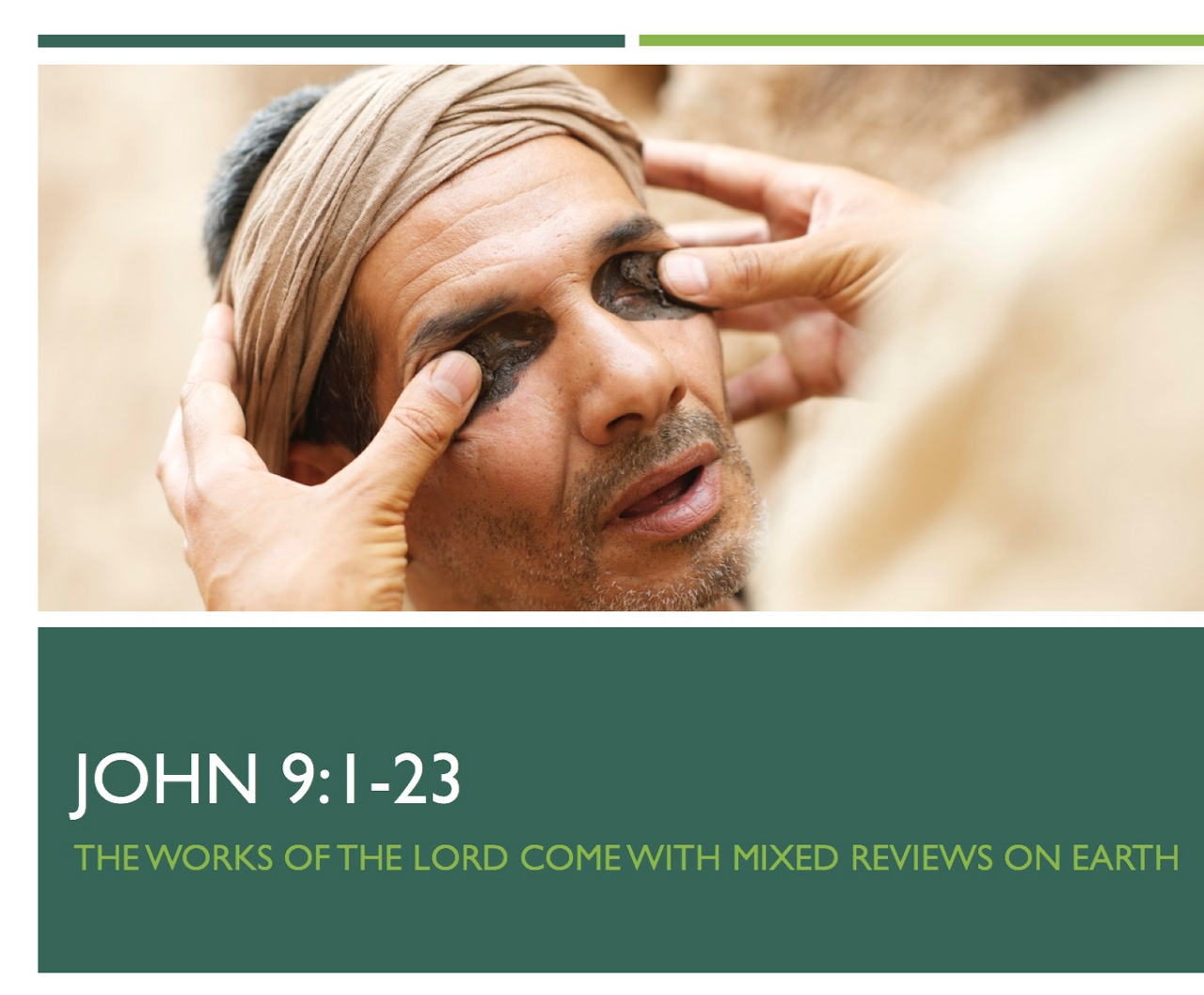 1 예수께서 길 가실 때에 날 때부터 소경된 사람을 보신지라 2.제자들이 물어 가로되 랍비여 이 사람이 소경으로 난 것이 뉘 죄로 인함이오니이까 자기오니이까 그 부모오니이까 3 예수께서 대답하시되 이 사람이나 그 부모가 죄를 범한 것이 아니라 그에게서 하나님의 하시는 일을 나타내고자 하심이니라