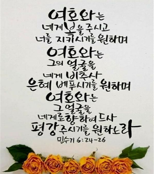“여호와께서 모세에게 일러 가라사대 아론과 그 아들들에게 고하여 이르기를 너희는 이스라엘 자손을 위하여 이렇게 축복하여 이르되 여호와는 네게 복을 주시고 너를 지키시기를 원하며 여호와는 그 얼굴로 네게 비추사 은혜 베푸시기를 원하며 여호와는 그 얼굴을 네게로 향하여 드사 평강 주시기를 원하노라 할찌니라 하라 그들은 이같이 내 이름으로 이스라엘 자손에게 축복할찌니 내가 그들에게 복을 주리라”