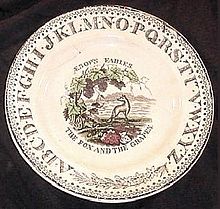 Croxall 에디션의 일러스트레이션은 어린이를 대상으로 하는 다른 인공물에 대한 초기 영감이었습니다. 예를 들어 18세기에 Chelsea , Wedgwood 및 Fenton 도자기의 식기에 나타납니다. 확실히 교육적인 목적을 가진 19 세기의 예에는 Staffordshire의 Brownhills Pottery에서 대량으로 발행된 알파벳 판에 사용된 우화 시리즈가 포함됩니다. 우화는 유아용 벽난로를 둘러싸는 타일 디자인 초기에 똑같이 사용되었습니다. 후자는 Mintons 에서 특별히 디자인된 시리즈가 있었던 19세기에 훨씬 더 인기가 있었습니다 . [96]Minton-Hollins 및 Maw & Co. 프랑스에서도 잘 알려진 La Fontaine의 우화 삽화가 종종 도자기에 사용되었습니다. [97]
