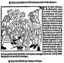 Eustache Deschamps는 14세기 말에 중세 프랑스어 로 쓰여진 도덕적 발라드 에 이솝 우화 몇 개를 포함시켰는데 , [26] 그 중 하나에는 '이솝이 그의 책에서 말하는 것'( Ysoppe dit en son livre et 라콘테 ). 대부분의 경우 우화를 말하는 것은 동시대 행동의 관점에서 도덕을 그리는 것보다 앞서지만 두 사람은 텍스트에 설명되지 않은 우화에 대한 문맥적 참조만으로 이에 대해 언급합니다.