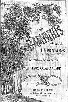 인도양 섬의 프랑스 크리올 버전은 카리브해보다 다소 일찍 시작되었습니다. Louis Héry [ fr ] (1801–1856)는 1820년에 브르타뉴에서 레위니옹 으로 이주했습니다 . 교장이 된 그는 La Fontaine의 우화 일부를 Fables créoles dédiées aux dames de l'île Bourbon (섬 크리올 우화 여성). 이것은 1829년에 출판되었고 세 판을 거쳤습니다. [ 71] 또한 로돌핀 영(1860–1932)이 1900년경에 라 퐁텐의 우화 49개를 세이셸 방언으로 개작했지만 1983년까지 출판 되지 않았습니다.Réunion creole (2007) [73] 은 그러한 적응에 대한 추가 동기를 추가합니다. 우화는 노예 문화의 표현으로 시작되었으며 그 배경은 농경 생활의 단순함에 있습니다. 크리올은 노예 주인의 도시적인 언어보다 더 순수하게 이 경험을 전달합니다.