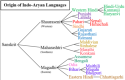 Bhojpuri는 인도 유럽 언어 이며 인도-아리아어족 의 동부 인도-아리아 그룹 에 속합니다 . Eastern Indo-Aryan 그룹 의 Magahi 및 Maithili 언어는 Bhojpuri의 가장 가까운 살아있는 친척입니다. Odia , Bengali 및 Assamese 도 밀접한 관련이 있습니다. [31] [32] Bhojpuri는 Magahi 및 Maithili와 함께 Bihari 언어 로 그룹화됩니다 . 동부 인도아리안의 다른 지부와 함께 비하리 언어는 마가디 프라크리트어 의 직계 후손으로 간주됩니다 .